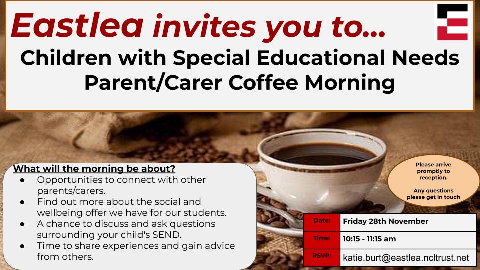 ☕ Eastlea invites parents and carers of Eastlea students with Special Educational Needs are warmly invited to our SEN Parent/Carer Coffee Morning.