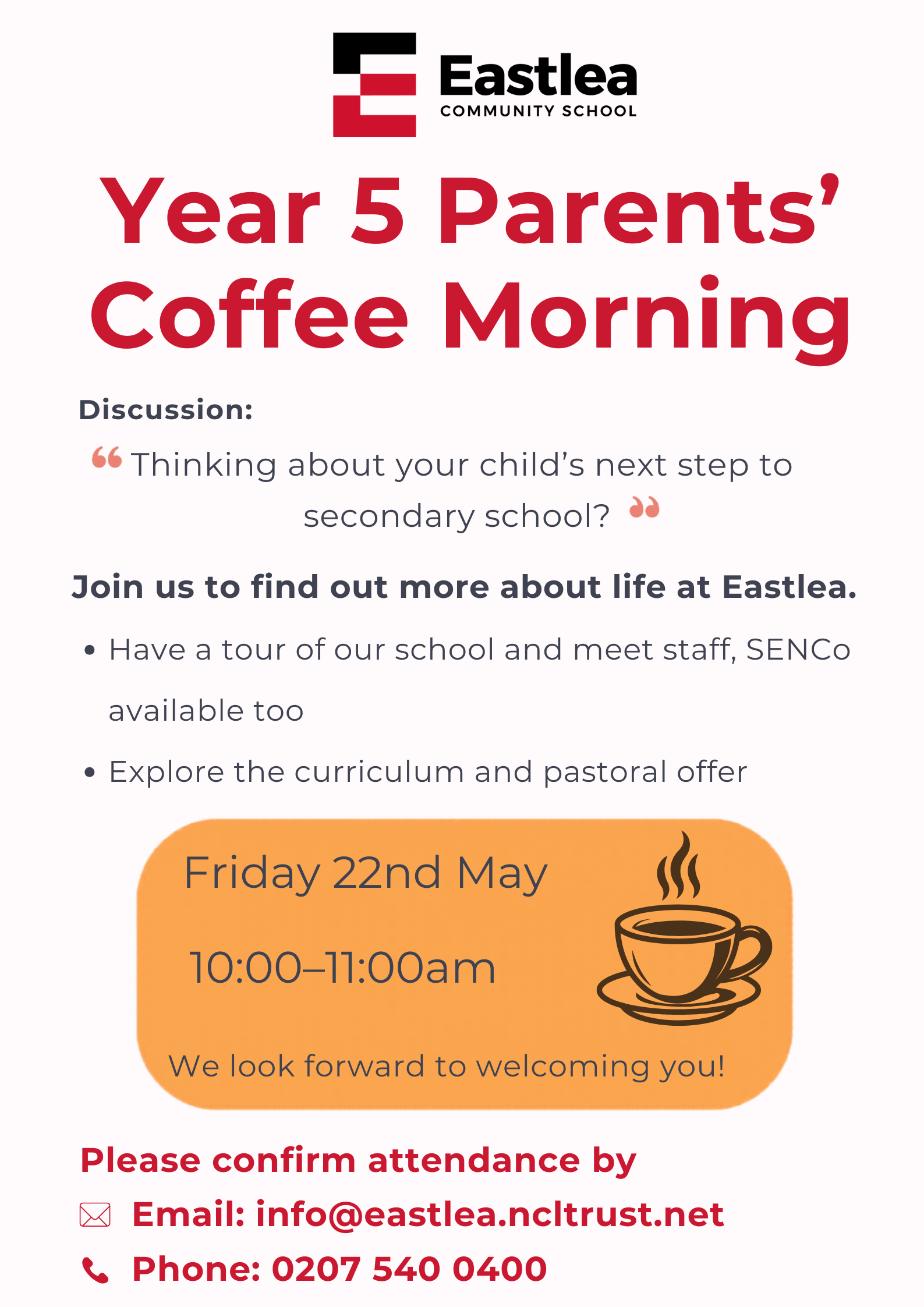 “Eastlea is recognised as a safe, kind and welcoming school, where equality, respect and tolerance lie at the heart of what we do. In our recent inspection the inspectors not only recognised the good quality of education but also noted the high ambitions we have for our students”