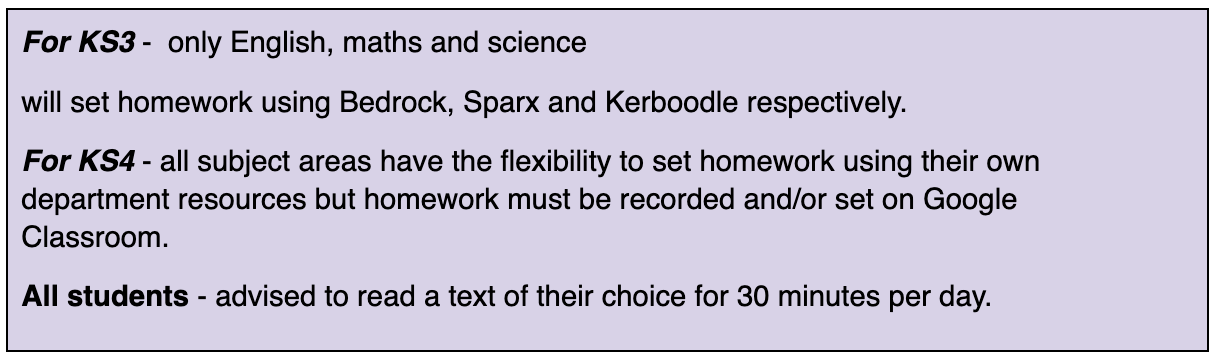 Homework tasks will focus on consolidation of learning to help students practice and embed the content and skills learned during their lessons in school. On average each Key Stage 3 (Years 7-9) homework will be approximately 30 minutes long, and Key Stage 4 (Years 10-11) homework will be 1 hour and 10 minutes long.